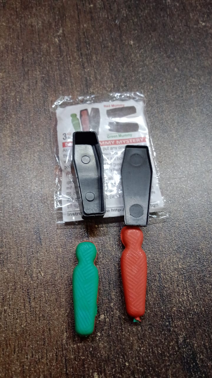 - MAGIC MUMMY MYSTERY Ask the audience to put any one mummy in the box. If the box bows down from top side then it will be red mummy and if it bows down from bottom side then it will be green mummy. And you will be able to identify that.